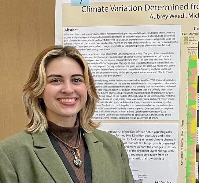 Aubrey Weed (2023-2025) worked on Lake Tanganyika sediment cores. Aubrey presented poster of her research at the GSA Annual Convention in 2025 and at the School of Geosciences Research Symposium (won award 2024). Awarded a Provost’s Undergraduate Research and Creative Activity Fellowship in 2024. Aubrey was a field assistant for research at Lake Tanganyika in 2025.